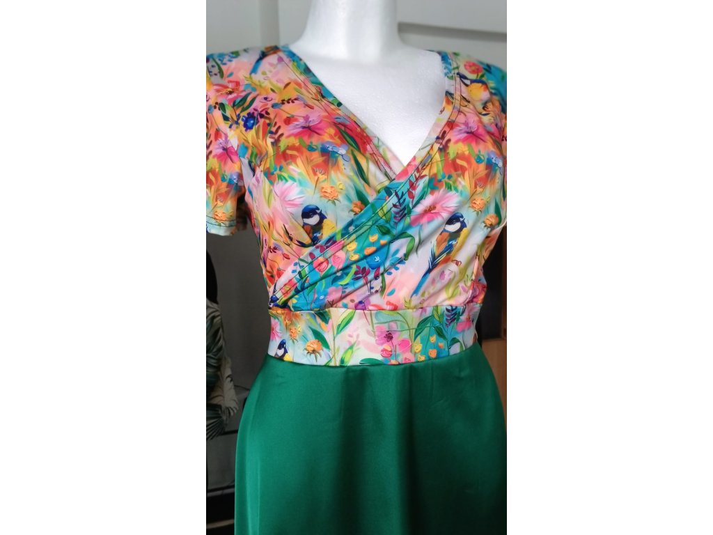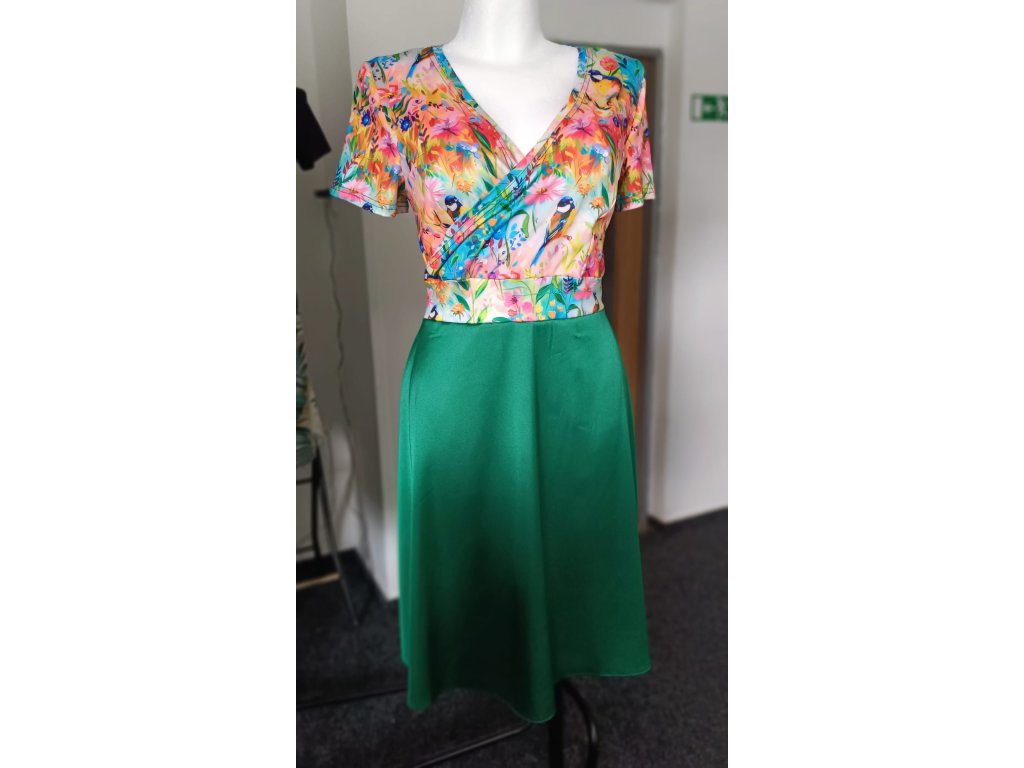 Šaty s překřížením v oblasti prsou evokují jemnost zavinovacího střihu,v pase jsou doplněné decentním páskem. Vrchní část z chladivé a příjemné venezie, Sukně z lehké silky se rozšiřuje do linie písmene ADíky použitému materiálu jsou lehké, v létě chladivé. Materiál: Kimo/silk armaniSložení polyester/elastan