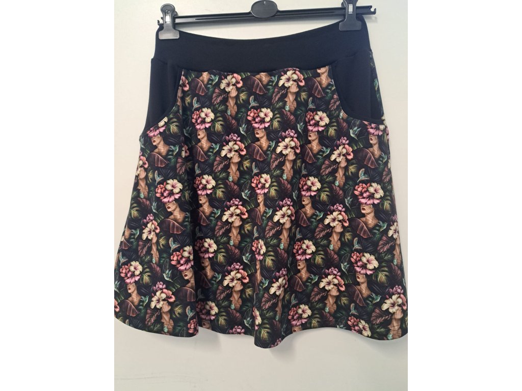 Hlavní část sukně zdobí výrazný tropický vzor velkých listů v tónech zelené, tyrkysové, smetanové a zlatavé, který působí svěže a elegantně. Praktické kapsy jsou vsazené do bočních švů a přirozeně navazují na vzor.